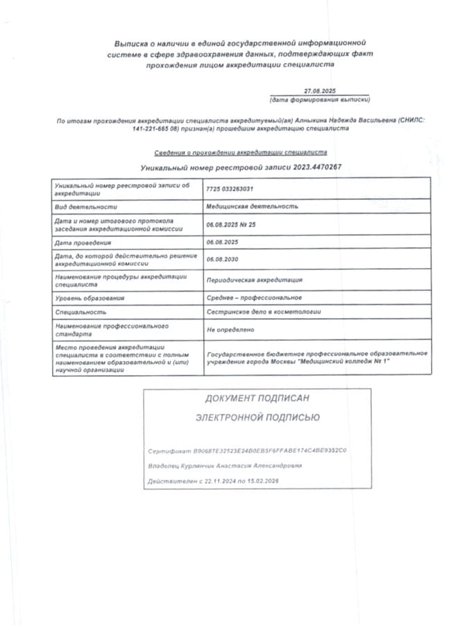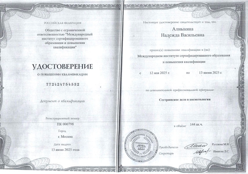 - 2025 г. – «Сестринское дело в косметологии», ООО «Международный институт сертифицированного образования и повышения квалификации», г.Москва