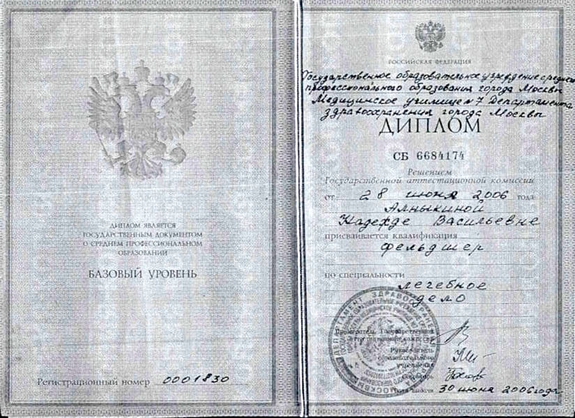 - 2006 г. – «Лечебное дело» (квалификация: фельдшер), ГОУ ПО «Медицинское училище №7» ДЗ г.Москвы