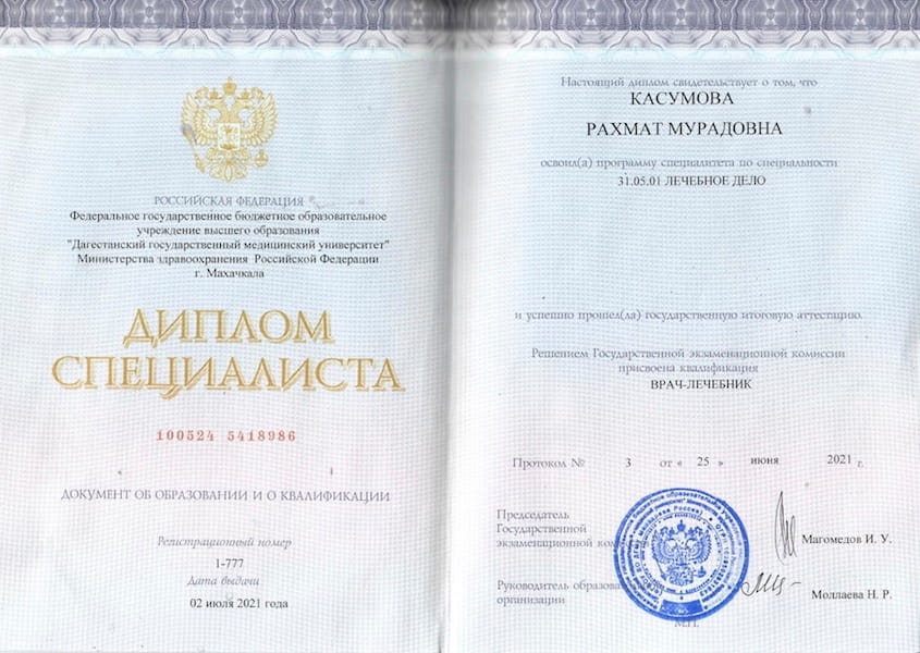 - 2021 г. – Дагестанский государственный медицинский университет, лечебный факультет, г. Махачкала