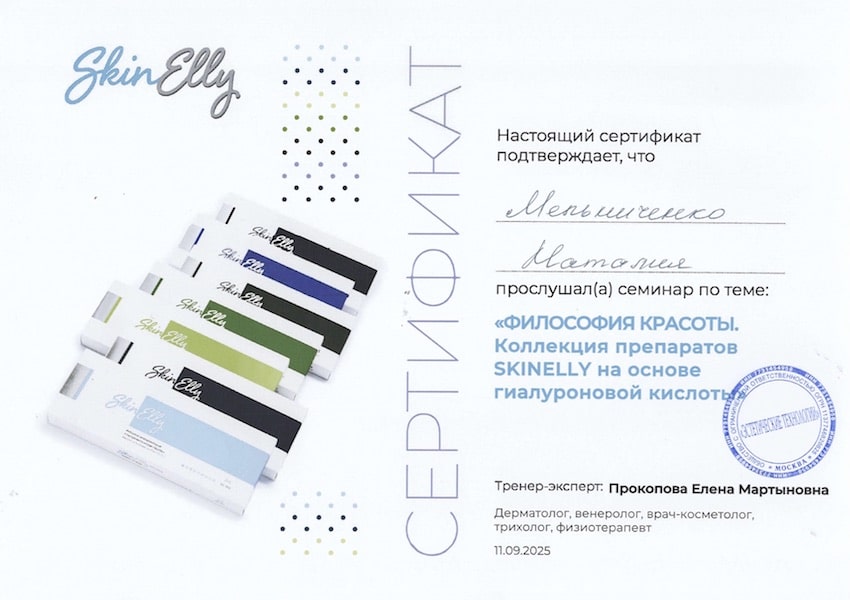 - 2025 г. – «Философия красоты. Коллекция препаратов SKINELLY на основе гиалуроновой кислоты», ООО «Эстетические технологии»