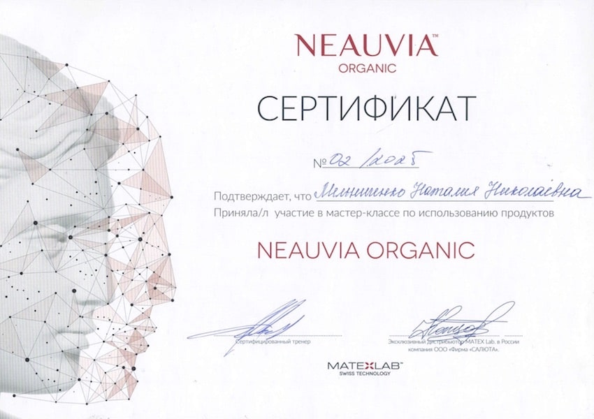- 2015 г. – "Методика работы с ботулиническим токсином типа А: Ботокс, Диспорт, Ксеомин, Лантокс, Релатокс, Нейронокс", Первый профессиональный институт эстетики