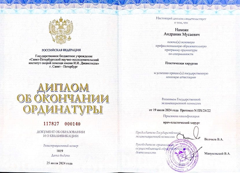 - 2024 г. – Ординатура по специальности «Пластическая хирургия», ГБУ «Санкт-Петербургский НИИ скорой помощи им. И.И. Джанелидзе», г.Санкт-Петербург