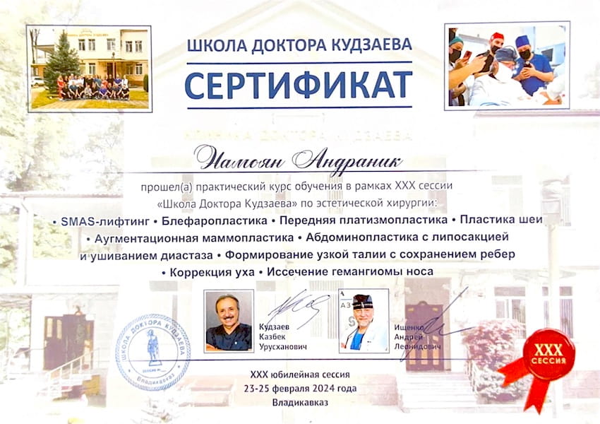 - 2024 г. – Практический курс обучения в рамках XXX сессии «Школа Доктора Кудзаева» по эстетической хирургии