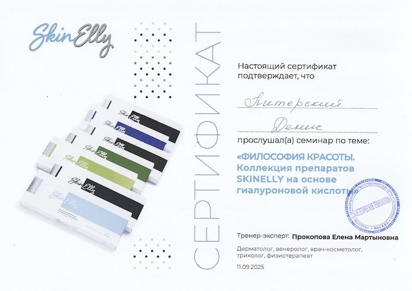 - 2025 г. – «Философия красоты. Коллекция препаратов SKINELLY на основе гиалуроновой кислоты», ООО «Эстетические технологии»