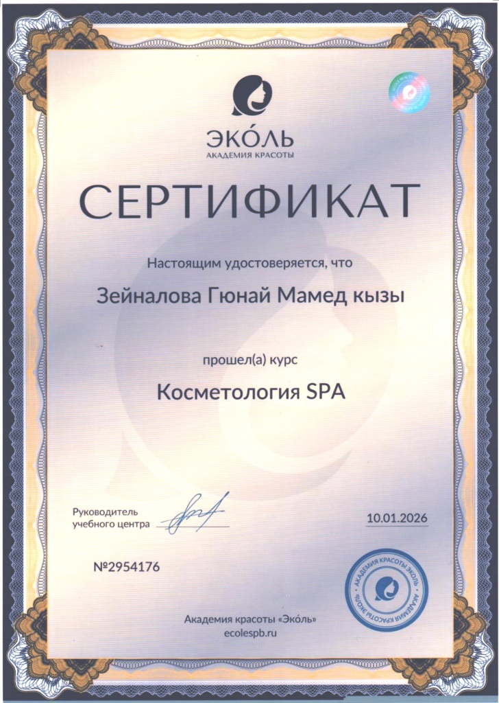 - 2026 г. – Академия красоты Эколь, курс «Косметология SPA»