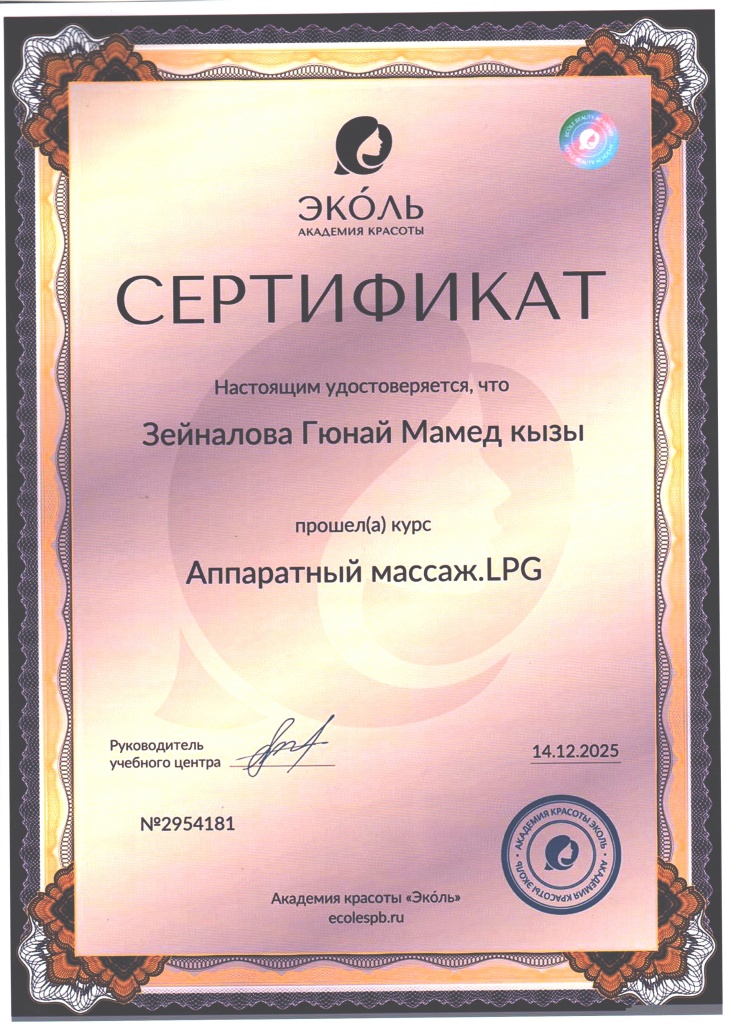 - 2025 г. – Академия красоты Эколь, курс «Аппаратный массаж. LPG»